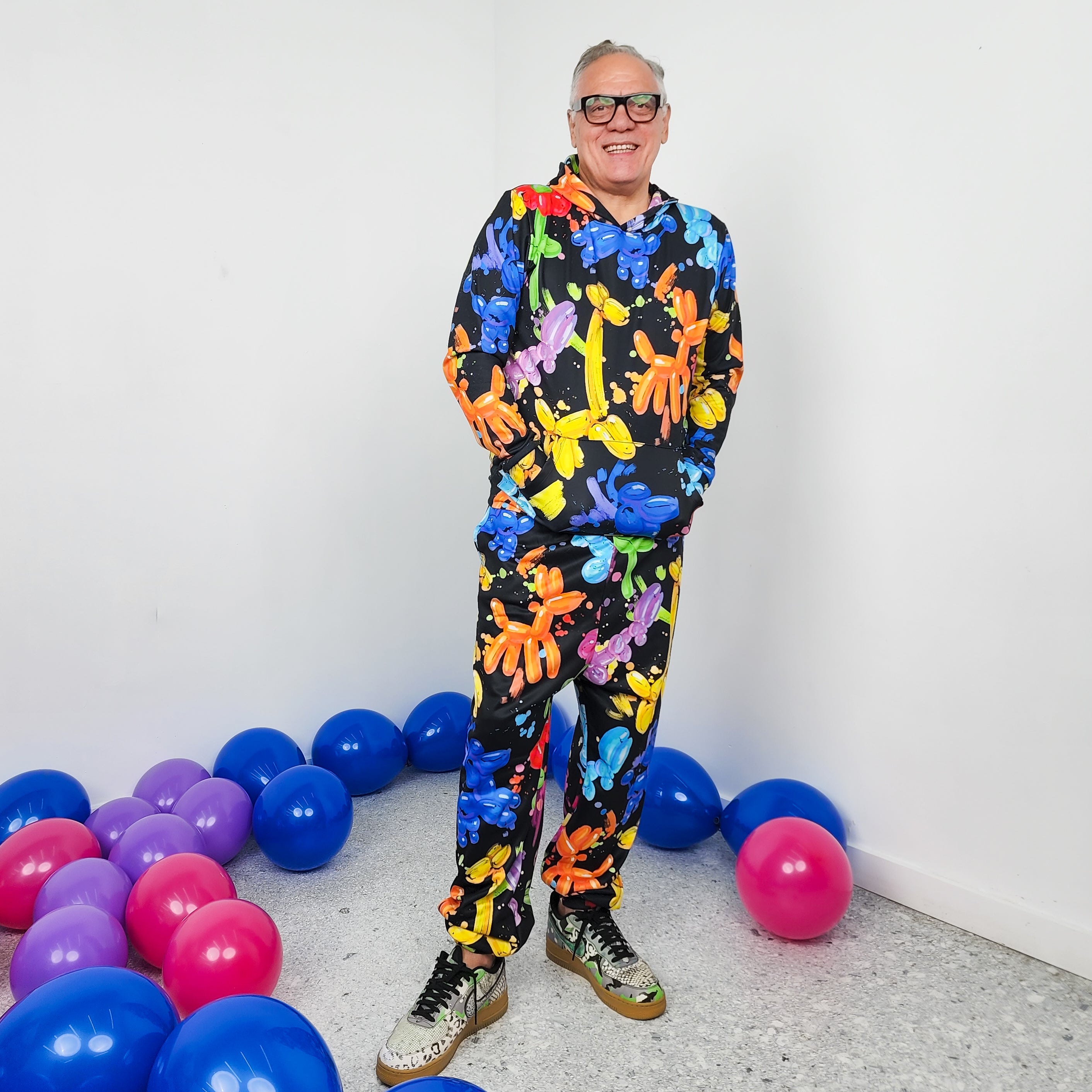 Su diseño combina perritos hechos en globo, mariposas, flores y trazos tipo pintura, creando un patrón pastel vibrante que transmite alegría y una energía súper positiva.